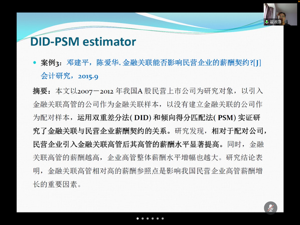 421日下午,应科研处、研究生院与万象城allwincity官网邀请,天津财经大学翟淑萍教授在腾讯网络会议室了主题为“处理效应的内生性及其解决2——PSM-DID”的学术讲座,万象城allwincity官网院长助理唐玮副教授主持,学院全体研究生聆听了本次讲座。